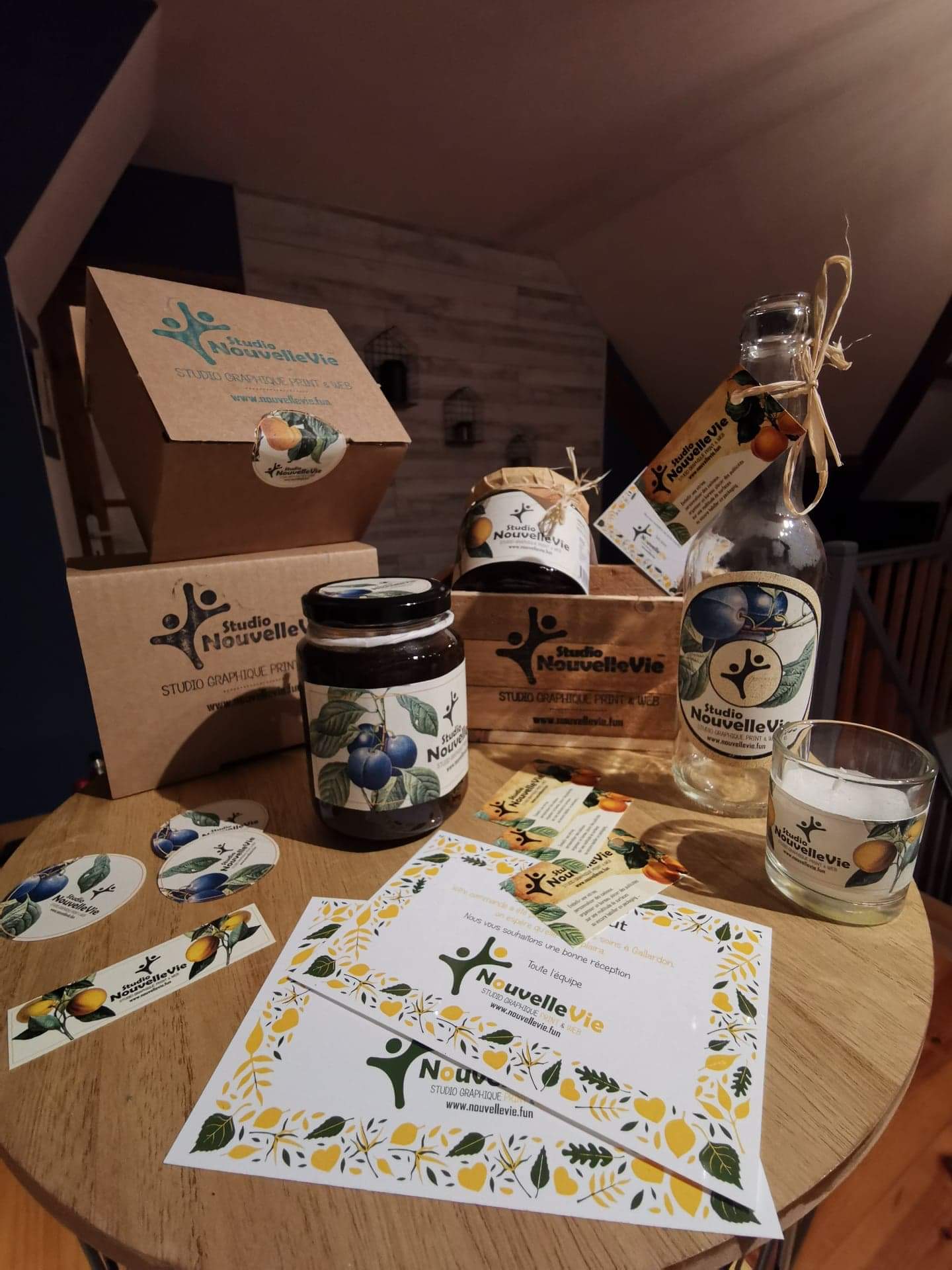 Prenez une grande quantité de création graphique, ajoutez vos produits, mettez une pincée de couleurs, une dose de bonne humeur et un zeste d'impression, déglacer le tout chez Studio NouvelleVie et quand les saveurs se mélangent vous obtenez un savoureux emballage chic et naturel :).